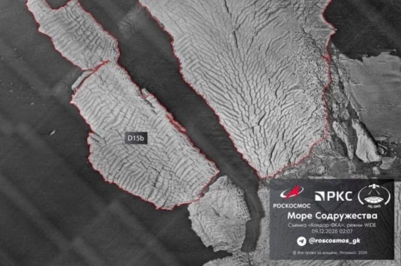 Роскосмос поделился новым снимком крупнейшего в мире айсберга D15A, который продолжает оставаться объектом наблюдения со стороны спутников госкорпорации.